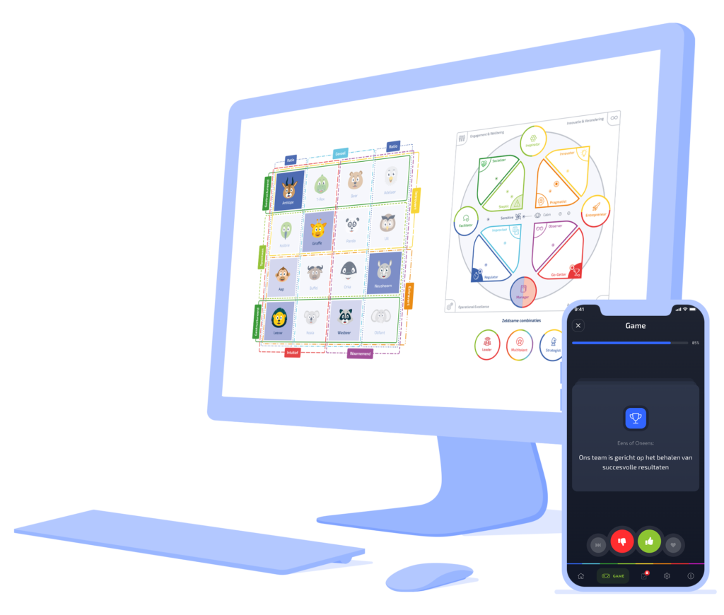Op basis van wetenschappelijk gevalideerde persoonlijkheidstesten, interesses en voorkeuren maakt TAEMio persoonlijke en teamprofielen. Gezamenlijk worden deze profielen gebundeld in persoonlijke, team- en corporate analyses. Op deze manier krijg je op een visueel aantrekkelijke manier inzicht in de krachten en valkuilen van jou, je team of je organisatie. Ideaal voor jou, je collega’s en/of teammanagers.